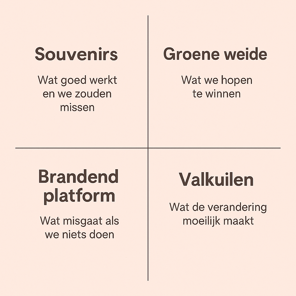 Ga met je team in gesprek en gebruik de vier kwadranten om samen te verkennen wat behouden mag blijven, wat wringt, wat lonkt en wat spannend is.